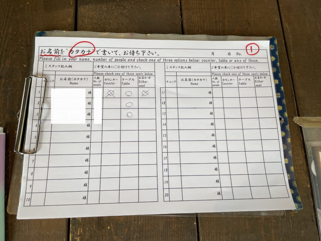 女将さんらしき人に「駐車場に3番目に入ったんですが、1番目に書いて良いんですか?」と念の為お聞きしましたが、「今待っている人は全員一巡目に入れるから問題ない」とのこと。